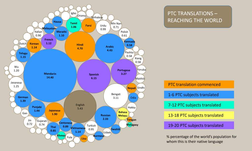 The diagram below shows the languages that have PTC translations and the percentage of the world’s population covered by these languages. Whilst much has already been achieved, there are plenty of opportunities for further translations. We regularly receive many requests for new translations and we are only limited by funding and finding the right people with skills for translating, including experience with html format.
